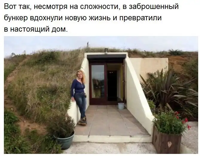 Британка Элизабет Страттон из местечка Сейнт Леван потратила 5 лет своей жизни, чтобы превратить старое бомбоубежище в добротный современный дом. Бункер, построенный в 1942 году для защиты местных жителей от немецких бомб, после войны стал ветшать и оказался совершенно бесполезным. Купив бомбоубежище вместе с прилегающей территорией за 143 000 фунтов стерлингов (220 000 долларов) и потратив еще 100 000 фунтов (154 000 долларов) на ремонт, Элизабет построила роскошные апартаменты с тремя спальными комнатами, большой гостиной, двумя ванными и просторной кухней. Кстати, сейчас это жилье продается за 275 000 фунтов стерлингов (424 000 долларов).