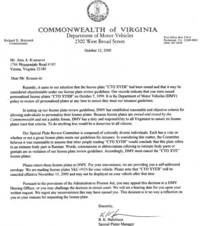 Краткий смысл письма: департамент транспортных средств штата Вирджиния просит в письме нового владельца специально заказанных номеров прислать их обратно, так как департамент узнал, что слова на номере обозначают "интимную часть тела" на русском языке. :)