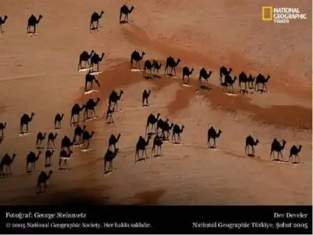 Считается лучшей фотографией года! Посмотрите поближе, верблюды — это маленькие белые линии на фотографии. То, что Вы видите в черном — это их тени....