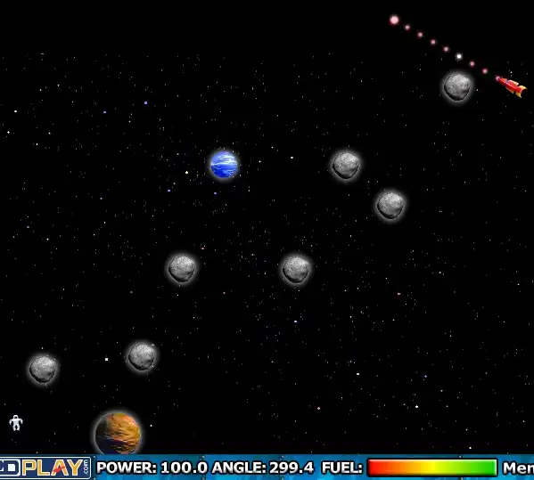 Меняя силу и угол запуска, запускаем ракету так чтобы она миновав все препятствия забрала космонавта.