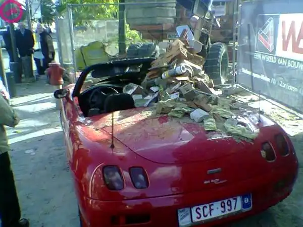 Не буду даже делать предположение, кто был за рулем этой машины. Но место для парковки водитель выбрал явно неправильно. Как раз под строительным рукавом по которому спускают на землю весь мусор с верхних этажей. Строители ребята простые, они каждый раз проверять не будут все ли чисто внизу. Результат налицо :) P.S. машинку жалко ![]()