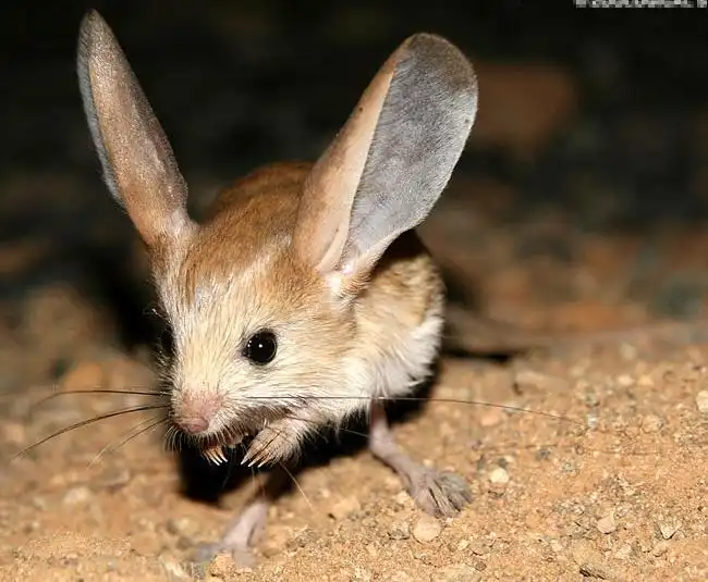 Это редкое животное впервые попало на фотографии. Необычно оно тем, что имеет очень большие уши, больше чем собственная голова. А задние лапки напоминают кенгуру, исходя из пропорций тела кажется, что этот тушканчик может прыгать на небывалые высоты. Еще на носу у животного «пятак», как у свиньи, а на конце хвоста — кисточка. Вообщем смешное животное получилось у природы :-).