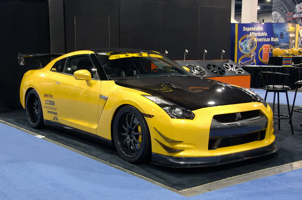 Nissan GT-R от Axis Sport Tuning. Редко можно увидеть желтый GT-R, но в компании Axis захотели, чтобы раскраска их выставочной модели соответствовала корпоративным цветам. На машине установлены диски Axis, а также детали для украшения экстерьера от Password:JDM. Показатели двигателя улучшили при помощи доработок от COBB Tuning.