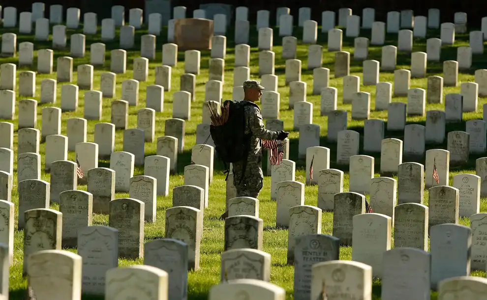 Солдат Старой гравдии армии США размещает флаги перед памятниками на Национальном кладбище в Арлингтоне, 21 мая 2009г Верджиния. 1300 солдатам, морякам и пехотинцам потребовалось более 3-х часов что бы разместить флаги перед более чем 300 000 памятников.