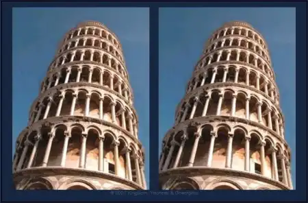 Говорят, что ее уже выпрямили и укрепили.Но раньше эта знаменитая башня стояла много лет наклонно, чем и была, в основном, знаменита. Перед вами два изображения Пизанской падающей башни,но обе фотографии абсолютно одинаковы, т.е. это один и тот же снимок. Тем не менее, кажется, что правая башня наклонена больше, как будто сфотографирована с другой точки.Иллюзия заключается в том, что наш мозг воспринимает две картинки так,как если бы они были частью одного целого.