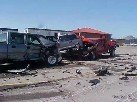 Из-за халатности сотрудников железной дороги грузовой вагон поехал под уклон, протаранил ограждение, сорвался с рельс и проехался по площадке с автомобилями. Итог - 19 автомашин можно отправлять в реанимацию.