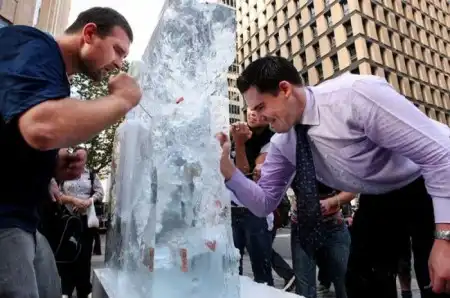 В Сиднее прошла рекламная акция новой марки одежды. На площади “Martin Place” поставили 400-килограммовый блок льда, в котором были заключены 1000 австралийских долларов. Чтобы их достать, нужно было потрудиться. На площади города собрались сотни искателей легкой наживы. С помощью кирок, ножей и других подручных средств они пытались разбить глыбу льда.