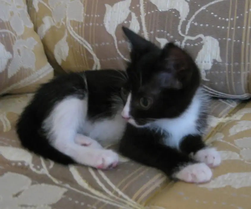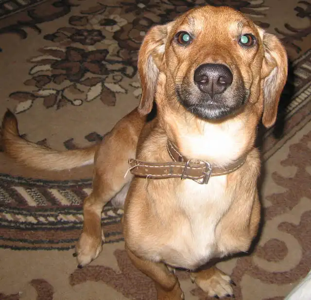 Кобель, с ошейником, на ошейнике висит карабинчик, нет края правого уха.