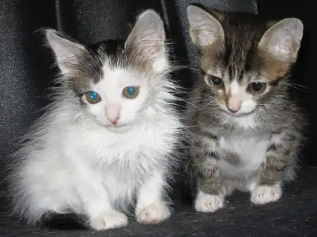 Вчера вечером обнаружила в подъезде 2-х котят серо-полосатого мальчика и невероятно пушистую бело-чёрную девочку, возраст примерно 1,5 месяца.
