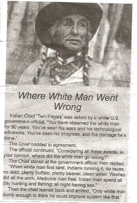 Очень интересная вырезка из старой газеты. Официальный представитель властей США задал вопрос старому индейскому вождю "Два орла" о том, в чем, по его мнению не правы белые люди, которые покорили Дикий Запад. Вождь улыбнулся и дал просто поразительный ответ.