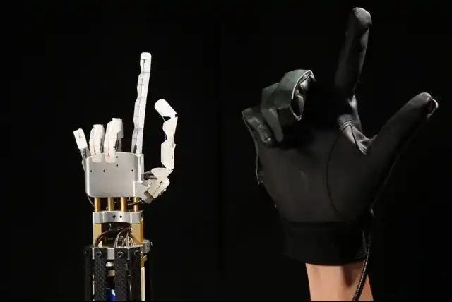 Механический манипулятор управляется с помощью перчатки оснащенной сенсорами, с высокой точностью и малым временем отклика.