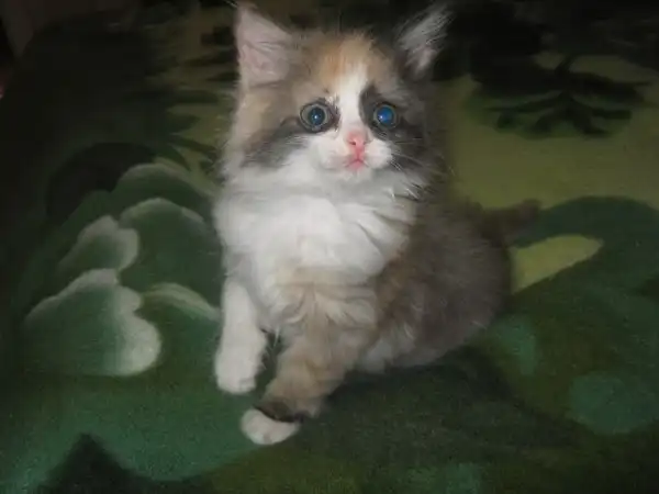 Окрас очень необычный, эксклюзивный, и красивые голубые, как небо, глаза!