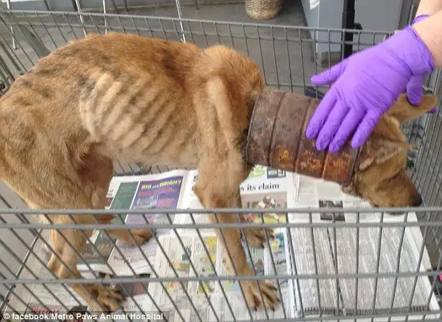 Собака была обнаружена на улицах Далласа с банкой из под кофе на шее. Нижняя и верхняя части банки были удалены, а цилиндр был на шее собаки. Когда добрый человек обнаружил псину, стало ясно что банка находилась на шее достаточно долго, т.к. кожа начала отрастать по краям банки.