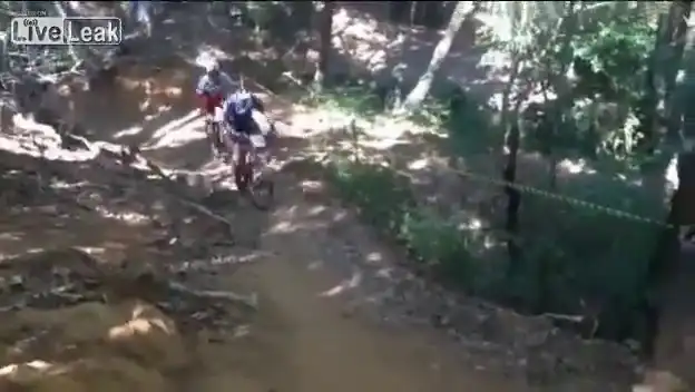Два профессиональных велосипедиста затеяли драку прямо посреди трассы. После того, как спортсмены обменялись парой хороших ударов, им пришлось продолжить гонку.