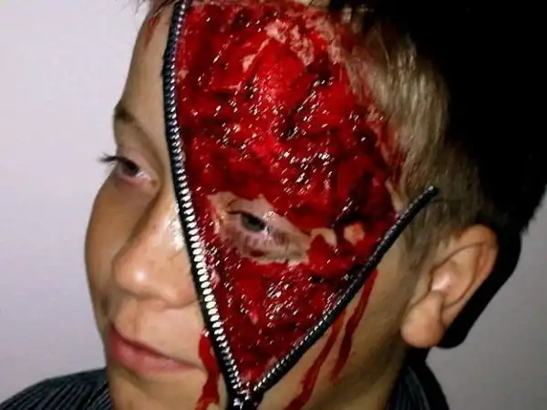 Похоже, одним из самых популярных и мрачных стилей макияжа для Хэллоуина является плоть, якобы расстегивающаяся с помощью молнии. При обладаниями некоторыми навыками нанесения грима и наличии молнии от джинсов, к примеру, можно сделать из себя персонажа фильма ужасов, от которого на вечеринке все будут шарахаться.