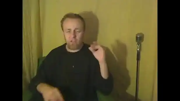 Мужчина, страдающий синдромом туретта, поет популярную песню. Иногда матюги, постоянно сыплющиеся из уст бедолаги, приходятся в такт песне :)