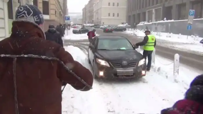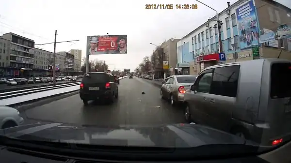 Пьяный пешеход переходя дорогу в неположенном месте пнул проезжающий автомобиль.