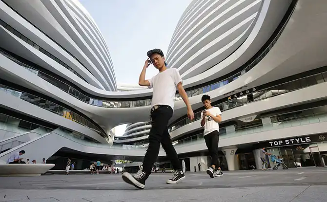 Современная молодежь Китая на фоне новых торгово-офисных комплексов в Пекине, 17 июля 2013. В Китае, если верить ООН, около 12% из 1.3 миллиарда жителей страны до сих пор живут менее чем на $ 1.25 в день. Это к вопросу о бедности.