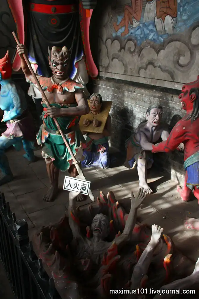 На самом деле, это даосский храм в городе Пинъяо, называется он Храм Городского Бога – Ченхуанмяо. Как и у многих других народов у китайцев есть представления об адских муках, в китайскую народную религию даосизм эти верования пришли из буддизма. Буддисты же позаимствовали их на Западе – у христиан и зороастрийцев. Поэтому изображения загробных мучений в китайских храмах будут тождественны подобным изображениям, например, в русских церквях.