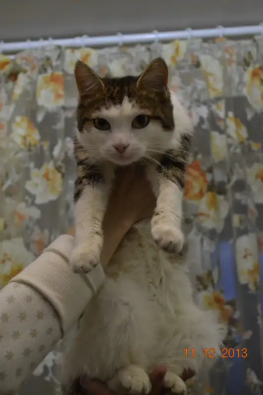 Кот Трой - окрас табби биколор (верх полосатый, низ белый), крупный красивый молодой кот, ему примерно 1 год. Кота принесли пристраивать на ярмарку и не забрали. Кот милый, ласковый, приятный в общении, очень смышленый и сообразительный, хорошо ладит с другими животными (кошками и собакой). Пользуется лотком, питается готовыми кормами. Кастрирован. А еще у него необычная симпатичная белая кисточка на хвостике.
