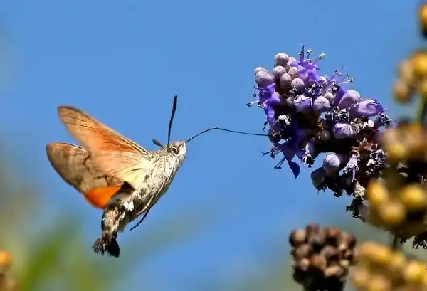 Над цветком завис языкан обыкновенный или бражник-хоботник (Macroglossum stellatarum) — крупный бражник, действительно видом напоминающий колибри. Именно этот вид чаще всего принимают за маленькую птичку, поскольку он летает в дневное время.