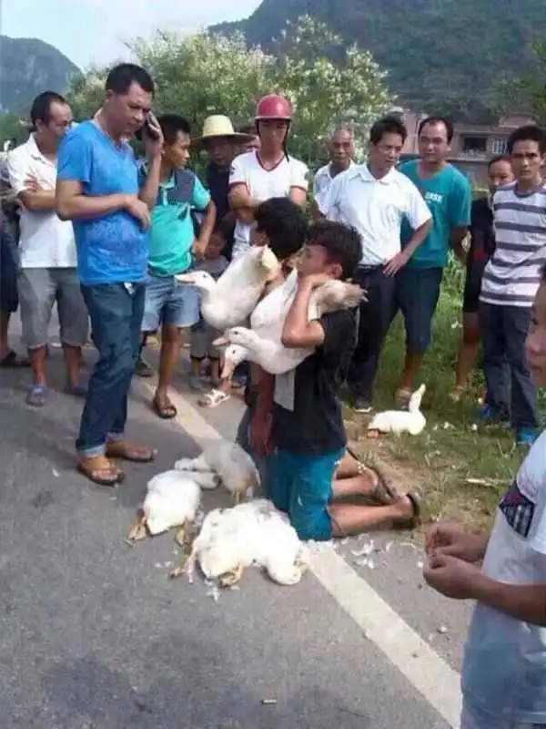 Двое малолетних китайских пареньков решили поживиться у местного фермера и попытались стырить нескольких уток, но были пойманы. В наказание их публично поставили на колени и заставили фотографироваться с украденной добычей. И еще в зубах ее держать - наверное, чтобы почувствовать вкус позора в полной мере.
