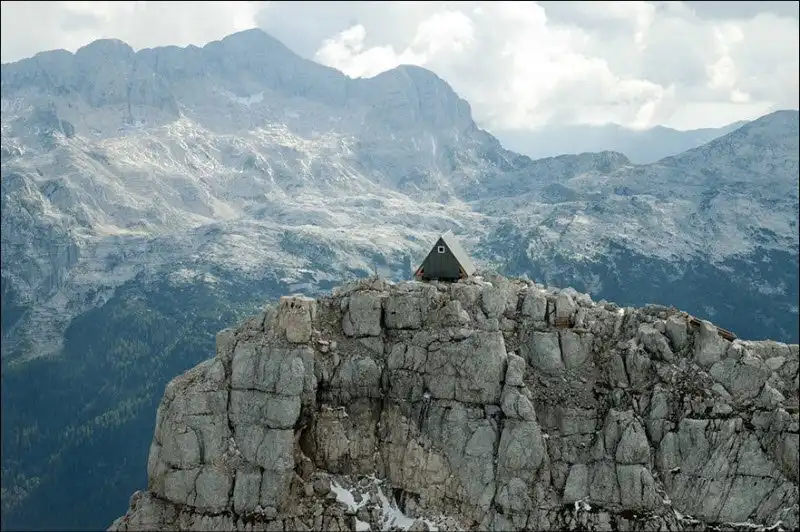 Эта хижина с панорамным видом на Альпы Джулиан в Италии всегда открыта для желающих переночевать в ней. Абсолютно бесплатно. Сложность в том, что придется совершить пешее путешествие на высоту 2530 метров! Домик построен в 2012 году. Материалы доставляли на вертолете. Всего потребовалось совершить 18 рейсов. Бригада из 12 строителей построила домик площадью 16 кв. метров за один день.