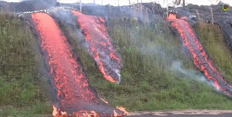 На острове Гавайи есть действующий вулкан Килауэа, и он потихоньку извергается начиная с 1983 года. Потоки лавы постепенно подбираются к населенному пункту Пахоа, в котором проживает около тысячи человек. Один домик лава уже похоронила.
