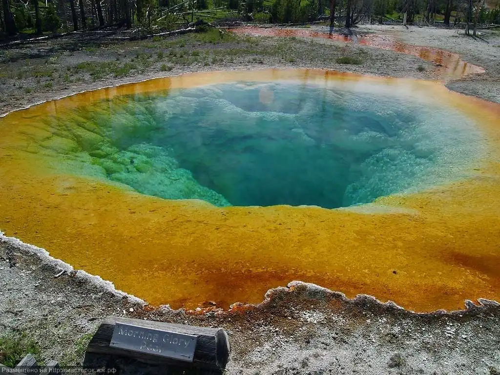 Этот уникальный горячий водоем находится на территории Йеллоустонского национального парка, США. Свое название озеро Утренней славы получило в честь цветка Утреннее сияние, расцветка которого имеет оттенок сапфирового цвета. Однако со временем традиция бросать на память в водоем монетку для того чтобы еще раз посетить эти места сыграла с озером злую шутку. Температура воды в озере снизилась со 100 градусов Цельсия до 70-50 градусов. Этот процесс привел к тому, что в водоеме начали размножаться всевозможные бактерии. Микроорганизмы «раскрасили» озера в удивительные цвета: цианобактерии в желтый, простейшие одноклеточные в оранжевый, грибы и водоросли в желто-зеленый, а мхи в коричневый.