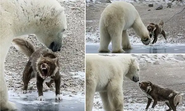 Здоровенный белый медведь подошел к ездовой собаке, но та не испугалась и начала нападать на медведя. Мишка то ли испугался, то ли был шокирован таким поворотом и отступил. Эти кадры снял итальянский фотограф Alberto Panizza в Канаде.