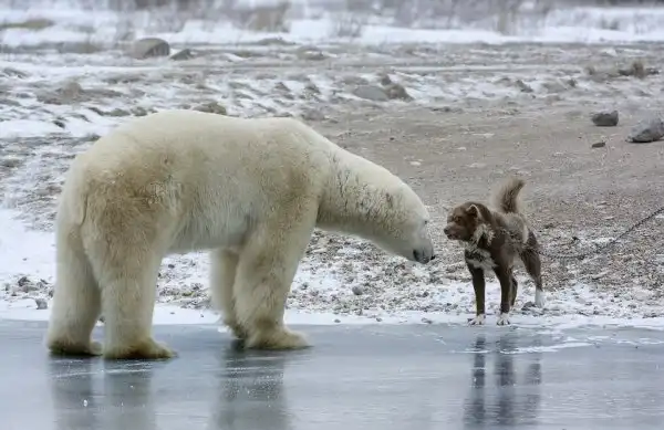 Белый мишка бродил недалеко от временного лагеря находившегося за пределами провинции Манитоба, Канада, и ради любопытства решил пойти проверить как там обстоят дела. Но не тут-то было. У входа в лагерь его встретил сторожевой пес, который дал медведю достойный большого зверя отпор.