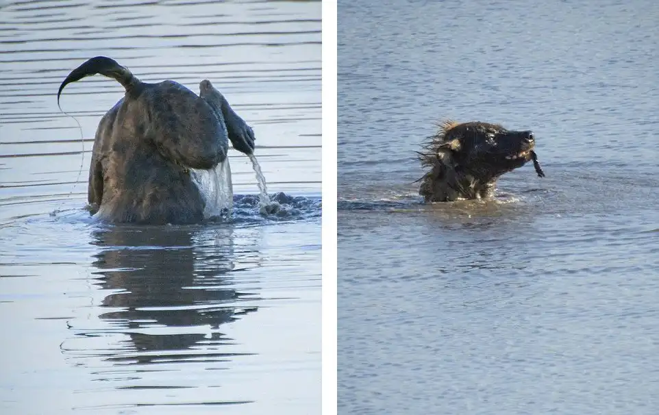 Казалось бы, гиена ловит рыбу, но нет, она ныряет целенаправленно, хочет что-то достать. Оказалось, гиена спрятала мясо под водой от других хищников. Эти кадры сняла Anja Denker (46) на водопое Этоша, Намибия.