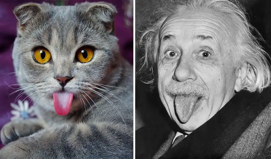 Одна из самых популярных фотографий Эйнштейна та, на которой он показывает язык. Мелисса, шотландская вислоухая кошка из России, становится невероятно похожей на этого ученого, стоит только ей высунуть язык!