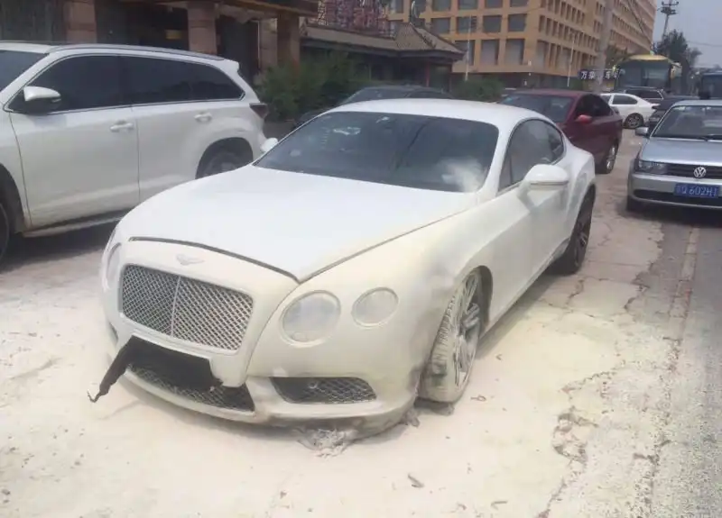 Житель Пекина арендовал на собственную свадьбу роскошный белый Bentley, стоимость которого оценивается в 650 000 долларов США. До конца непонятно, как под припаркованной около отеля оказались петарды, но пока забирали невесту, машина загорелась.