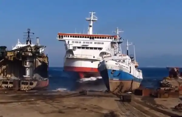 Impression of a Ki-51 «Sonia» kamikaze on the hull of the HMS Sussex. The Sonia (reported as a Val, as often happened), is said to have hit the water before hitting the hull, probably losing its bomb in the process. / Отпечаток Ki-51 «Sonia» камикадзе на корпусе тяжелого торпедного катера Sussex. «Соня» ударилась об воду перед столкновением с корпусом, возможно потеряв при этом свою бомбу.
