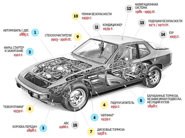 Используя в разговоре привычные автомобильные термины – ДВС, «автомат», кондиционер, дисковые тормоза, ESP – мы даже не задумываемся об истории их возникновения. Мы решили восстановить справедливость и вспомнить, когда и на каких автомобилях появились нововведения, которыми мы пользуемся каждый день.