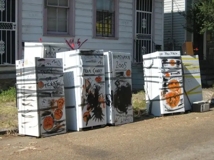 Ураган Катрина, обрушившийся на побережье Мексиканского залива и американский город Новый Орлеан, заставил многих людей надолго покинуть свои дома. Во время эвакуации жильцы затопленных домов старались брать с собой все самое необходимое, оставляя холодильники набитыми едой. В свои дома жители города вернулись спустя недели или даже месяц, и не трудно догадаться, что они обнаружили внутри холодильников. Избавиться от неприятного запаха было просто невозможно, немало холодильников оказались испорченными и их попросту выносили на улицу, оставляя у дома. Вывозили холодильники очень долго, поэтому на них начали появляться граффити и различные надписи. Предлагаем взглянуть, как в то время выглядели улицы Нового Орлеана.
