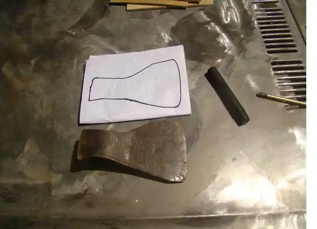 Итак, для начала нам понадобится сам топор. Это самое важное. Я купил лезвие на барахолке у одного дедушки (точно не помню, но кажется цена была около 50 рублей). Когда я принес его в мастерскую, то сразу приложил на листик и обвел маркером. На самом листике я уже примерял формы и думал над изгибами. В итоге я сошёлся на том мнении, что лучше сделать лезвие с выемкой.