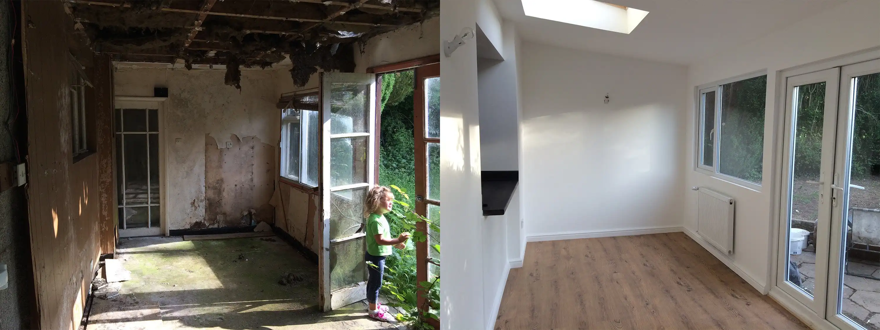 После долгих раздумываний я решил купить заброшенный домик и привести его в божеский вид своими руками. С левой стороны фотографии дома как только я его купил и с права конечный резултат 10 неделной работы.