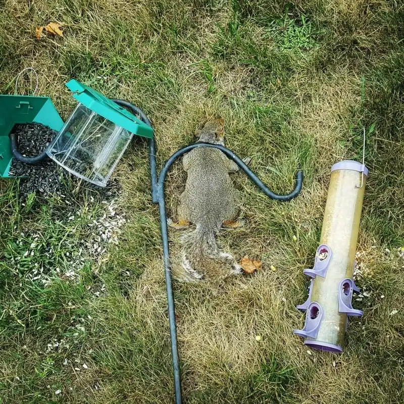 Добродушный чувак установил во дворе своего дома кормушку для белки. Только вот закрепил он ее не на дереве, а на какой-то металлической подставке. Рано или поздно хлипкая конструкция должна была упать, но никто не мог предположить, что именно так.