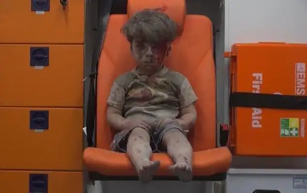После авиаудара по жилым кварталам города из-под обломков разрушенного жилого дома спасателям-добровольцам удалось вытащить 5-летнего мальчика, Омрана Дакниша. Его лицо было залито кровью, но при этом ребенок не выказывал никаких эмоций, отрешенно уставившись в пустоту...