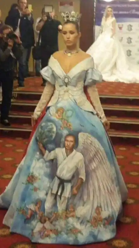 Мода на странные платья добралась и до России. Далее предлагаем взглянуть на наряды, которые были представлены публике на модном форуме «Духовная миссия Владимира Путина. Геополитические вызовы современности».