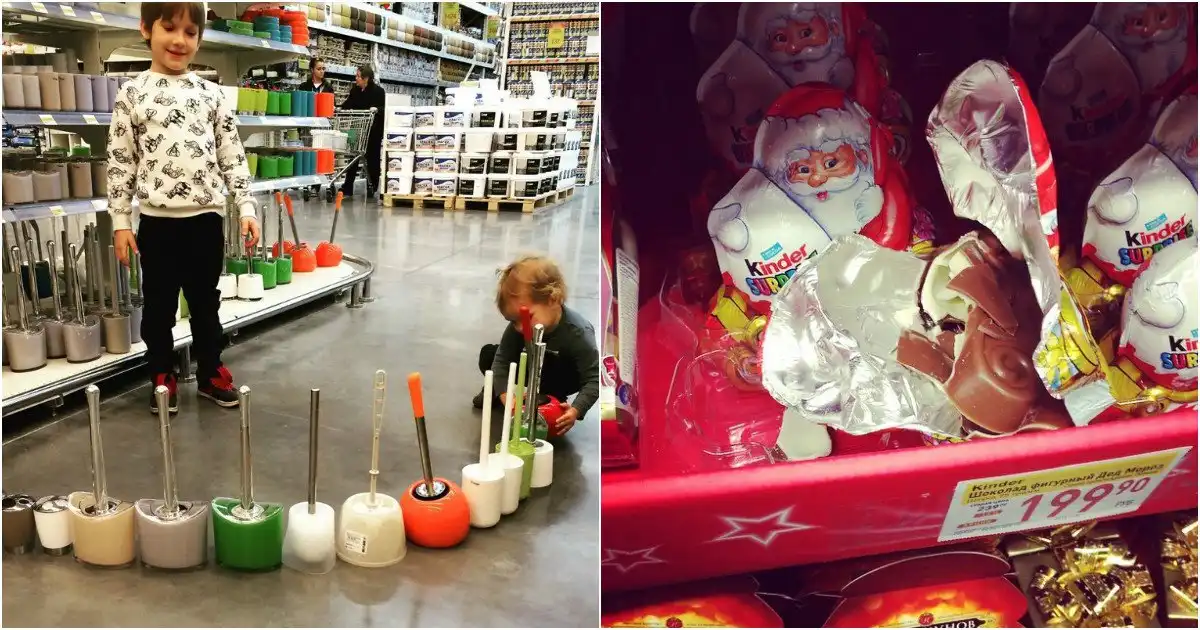 По всей видимости, дети воспринимают любой магазин как площадку для игр, а потому сразу же находят себе там какое-нибудь развлечение по душе. И пока родители занимаются выбором нужных товаров, продавцы вынуждены следить за детьми, дабы предотвратить погром. Но уследить за всеми невозможно, особенно если магазин большой, потому и получаются такие вещи!