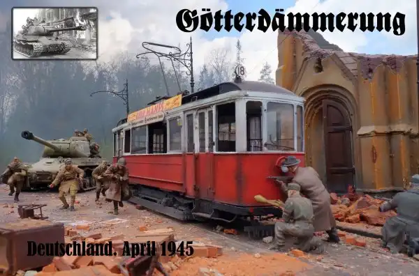 Диорама создавалась в рамках групбильда, посвященного краху Рейха. За основу композиции взял трамвай MAN/SSW от Миниарта, наступающие советские войска представлены танком Ис-2 (Тамия) и набором советской пехоты от Stalingrad. Присутствие на диораме Фольксштурма (набор от Звезды) подчеркивает трагичность и безысходность дальнейшего сопротивления. При фотосессии старался максимально использовать дымы для приближения боевой обстановки.