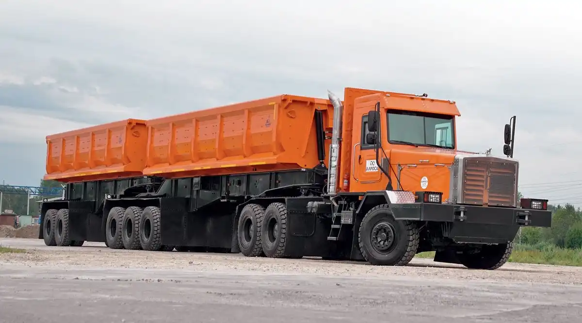 Трехзвенный автопоезд, созданный усилиями под-московных автостроителей, впечатляет своими характеристиками. Длина новинки составляет свыше 26 м, ширина — более 3 м, высота — около 5 м, грузоподъемность — 130 тонн, объем кузова — порядка 70 кубов!