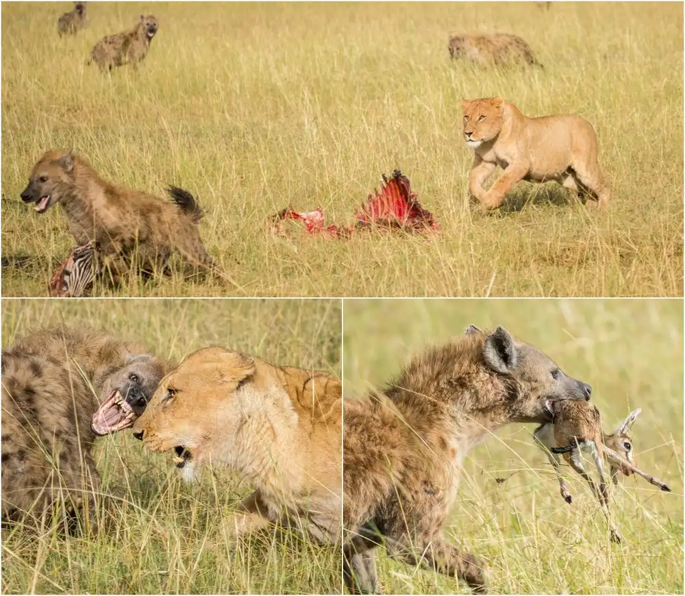 Эти интересные кадры сделал немецкий фотограф Инго Герлах (Ingo Gerlach) в самом сердце заповедника Масаи Мара в Южной Кении. Путешествуя по парку, опытного фотографа привлекли рычащие звуки. После преодоления небольшого холма на внедорожнике, он увидел источник шума. Два льва доедали зебру под вой и визг стаи гиен. Некоторые гиены пытались отнять мясо у львов, но это у них не получилось. Пришлось ждать, пока львы наедятся и довольствоваться объедками.