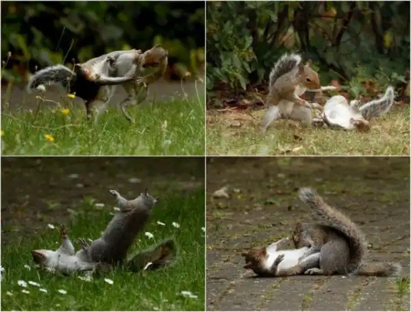 47-летний фотограф-любитель Мартин Докер (Martin Docker) сделал эти удивительные кадры в саду Собачьего острова Лондона. Фотограф говорит: "У меня много снимков птиц, лис и других животных, которые бегали в саду, но на этот раз природа удивила". Две белки, словно в сцене из фильма о боевых искусствах, подпрыгивали и наносили удары друг другу. Неизвестна причина драки и сколько бы продолжался этот бой, но один из зверьков применил грязный прием — он укусил соперника. Тот взвизгнул и убежал.