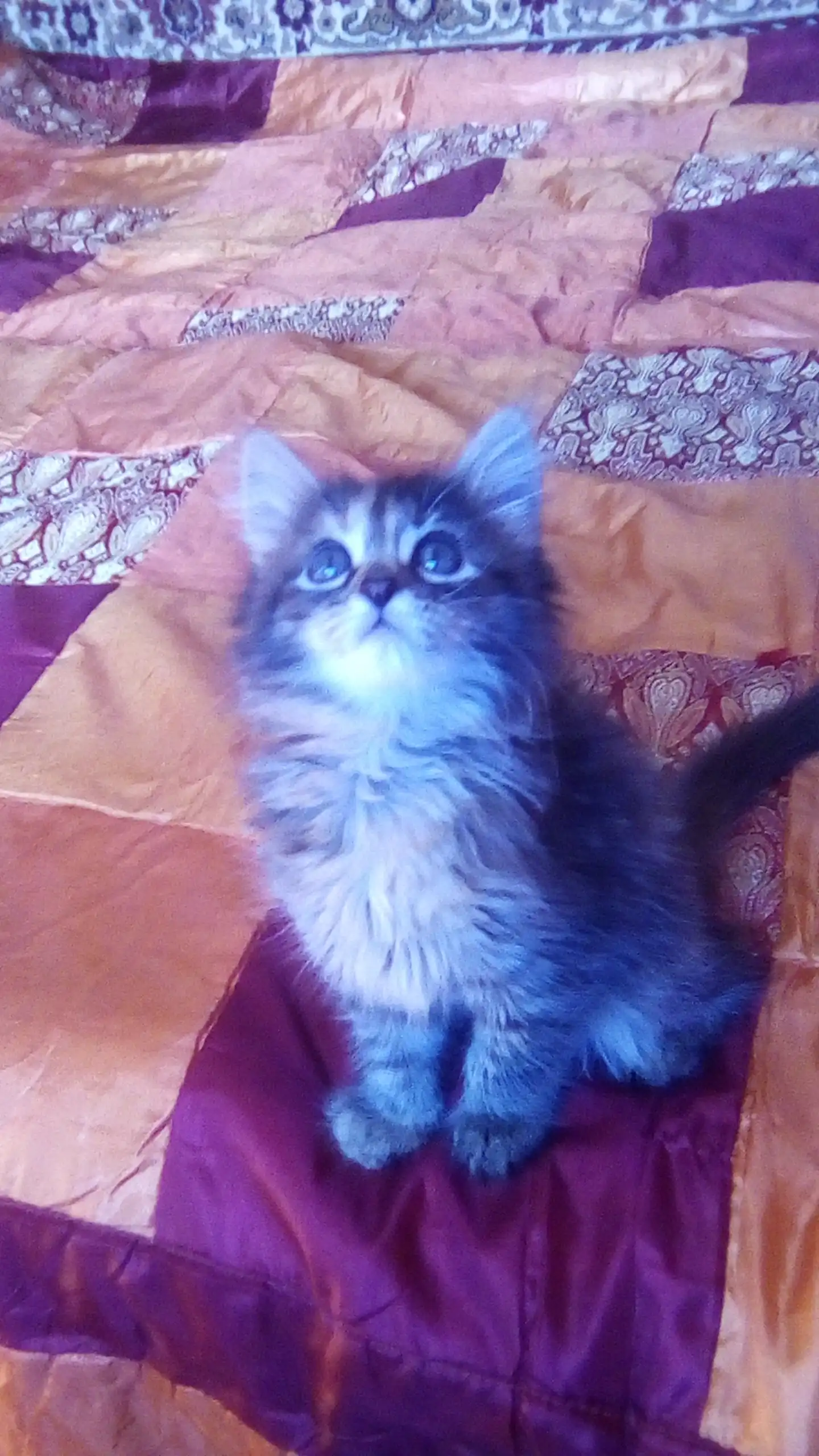 Окрас черепаховый, очень пушистая. Спокойная, ласковая, других животных боится.