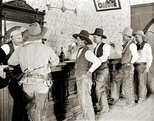 Первый салун Дикого Запада появился в 1822 году в Браун Хоул, что в Вайоминге, и обслуживал местных звероловов в сезон охоты. Такая форма досуга стала необыкновенно популярной. Например, в городке Ливингстон в Монтане в 1883 году на 3000 жителей приходилосьь 33 салуна. Ковбои, негоцианты, охотники, бродяги, золотоискатели, адвокаты, железнодорожники - пили, играли в покер, дрались - в общем, все как в кино.