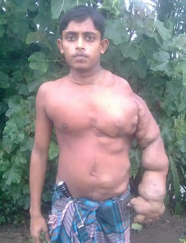 Три месяца назад на руке 19-летнего Раджиба Гейн из Бангладеш появилась большая опухоль и стремительно распространилась на спину, грудь, живот и ногу. Из-за своего состояния тщедушный подросток не может самостоятельно ходить или переодеваться и вынужден просить помощи у домочадцев.